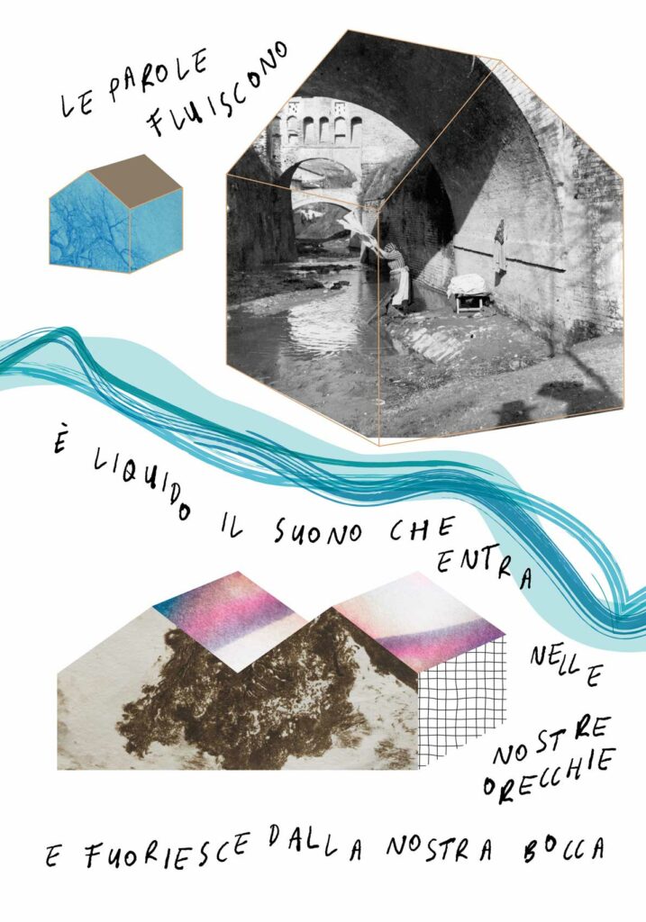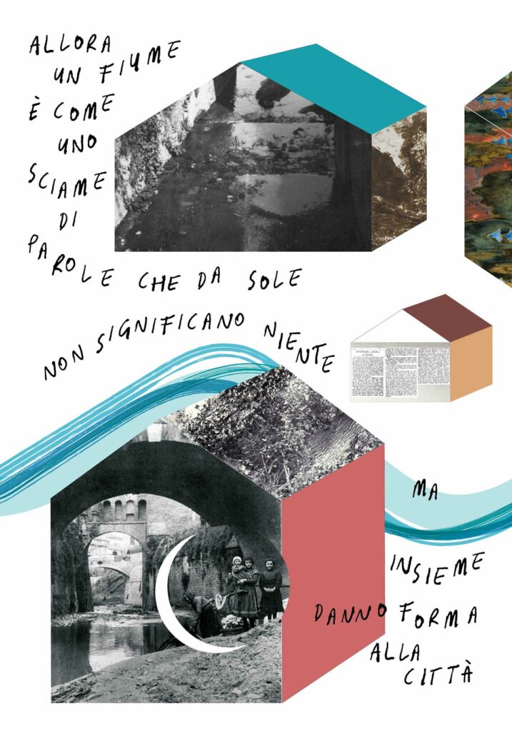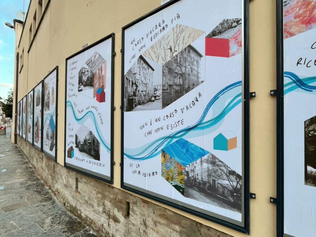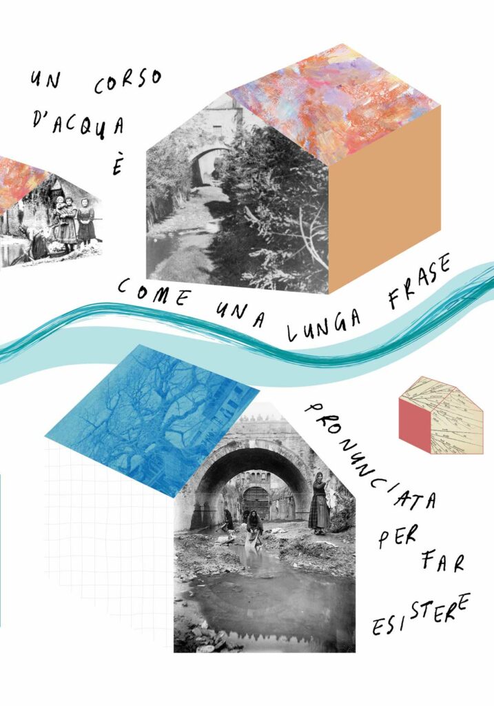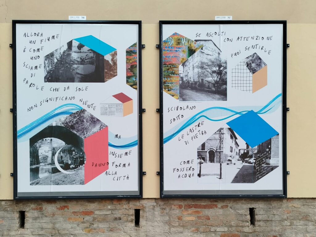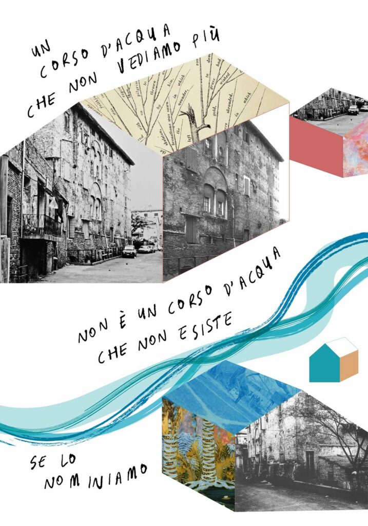 Per la tipologia di co-progettazione che precede la nascita di questo intervento visivo e sulla base delle indicazioni fornite dalla committenza, ho scelto di guardare ai nove manifesti come a un’installazione unica. Un leporello a grande formato che raccontasse, attraverso le immagini fotografiche, la storia di quella porzione di paesaggio urbano. Mi sono quindi affidata alla poesia visiva e alla composizione grafica per innescare una lettura su due livelli che evocasse l’elemento urbano del fiume che prima scorreva al posto della via tombinata negli anni Trenta. Tra immagini storiche e narrazione, chi guarda può scegliere se addentrarsi nel racconto oppure fruire della serie di immagini nella sua totalità.