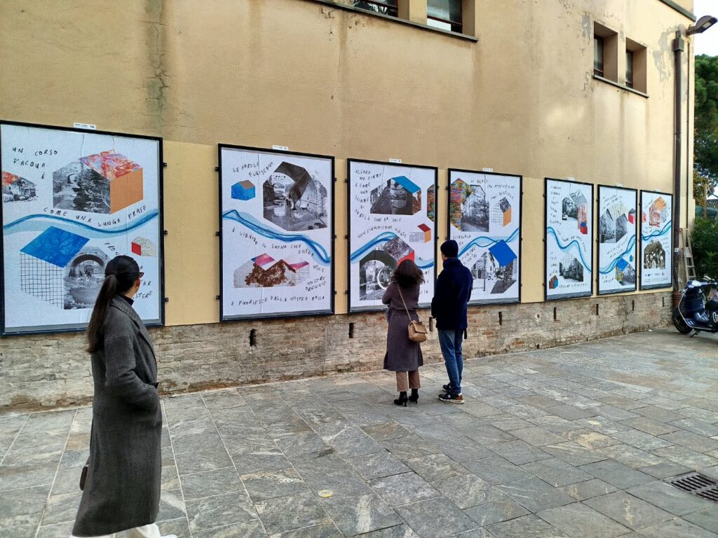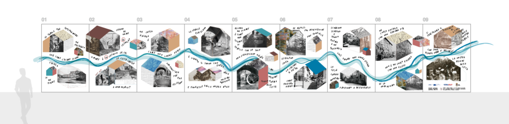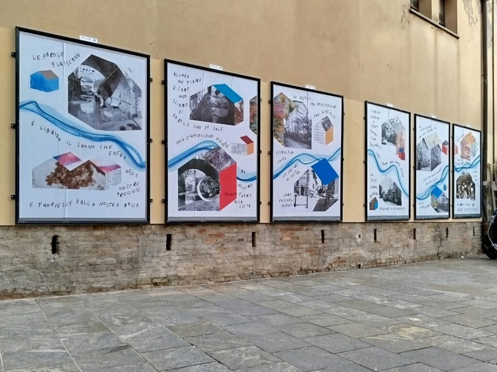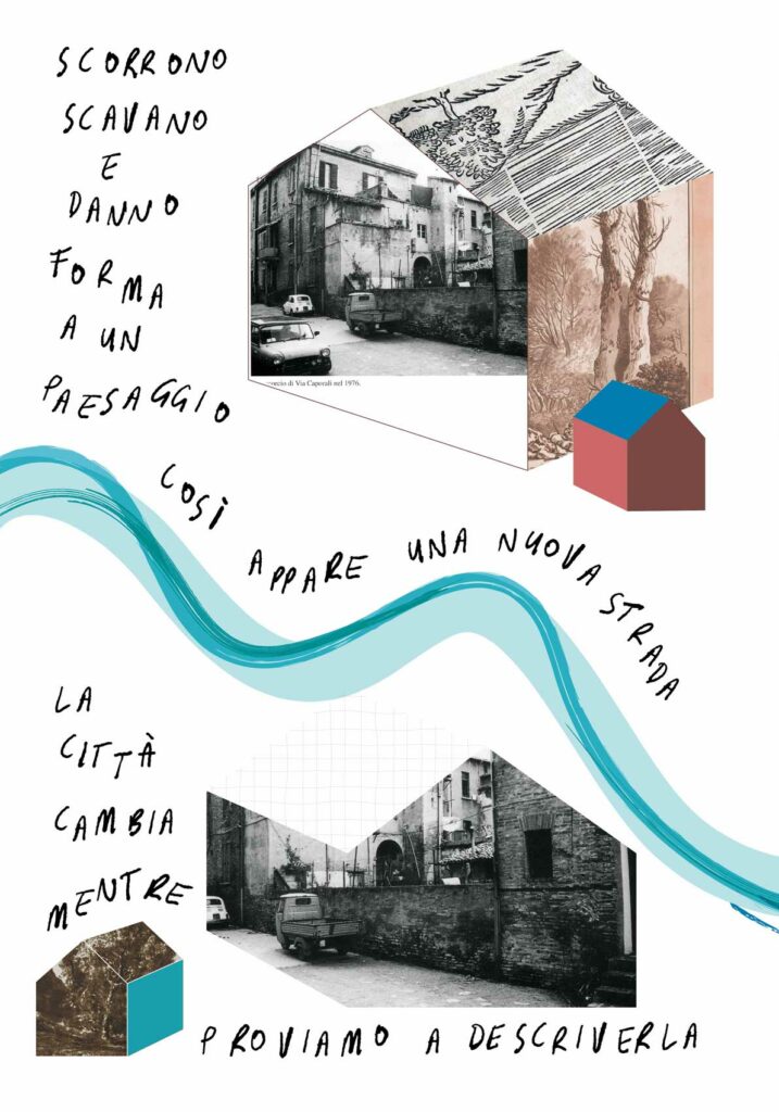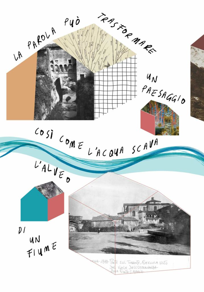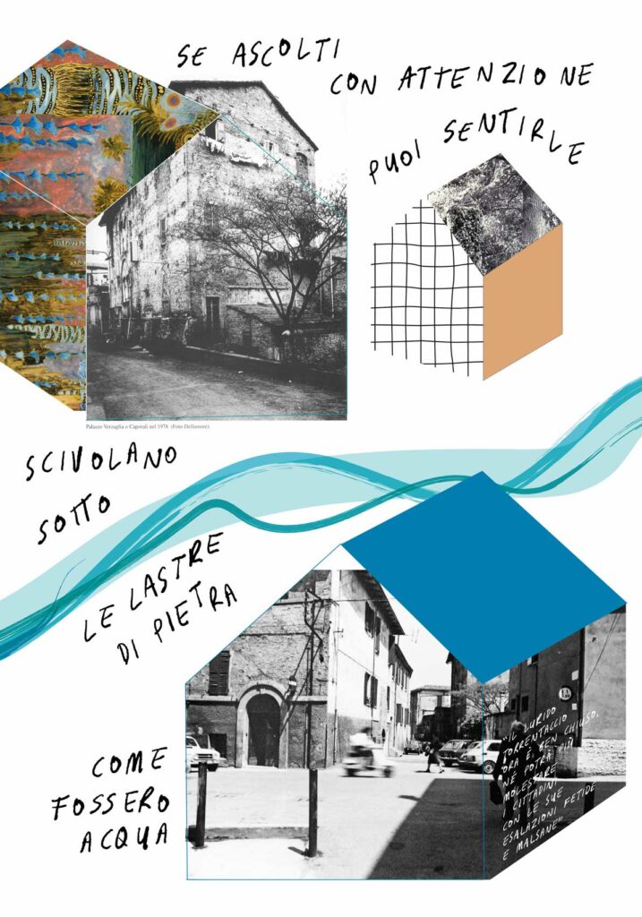 Per la tipologia di co-progettazione che precede la nascita di questo intervento visivo e sulla base delle indicazioni fornite dalla committenza, ho scelto di guardare ai nove manifesti come a un’installazione unica. Un leporello a grande formato che raccontasse, attraverso le immagini fotografiche, la storia di quella porzione di paesaggio urbano. Mi sono quindi affidata alla poesia visiva e alla composizione grafica per innescare una lettura su due livelli che evocasse l’elemento urbano del fiume che prima scorreva al posto della via tombinata negli anni Trenta. Tra immagini storiche e narrazione, chi guarda può scegliere se addentrarsi nel racconto oppure fruire della serie di immagini nella sua totalità.