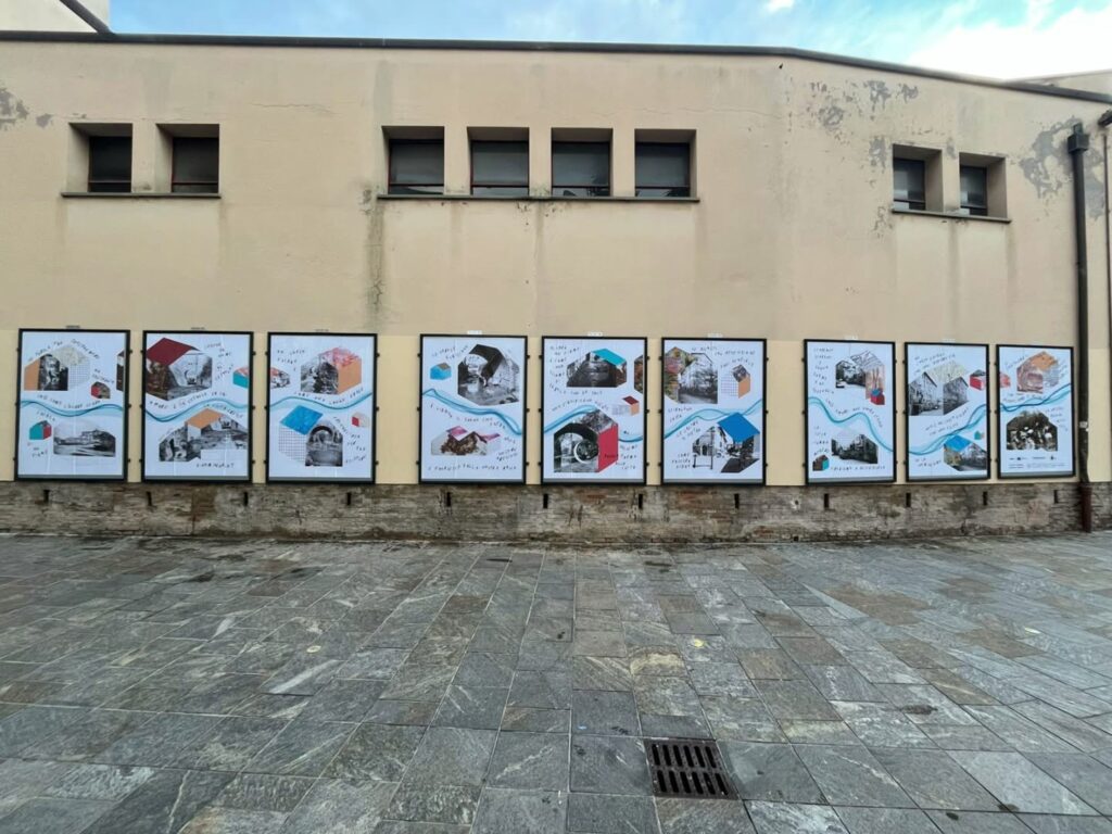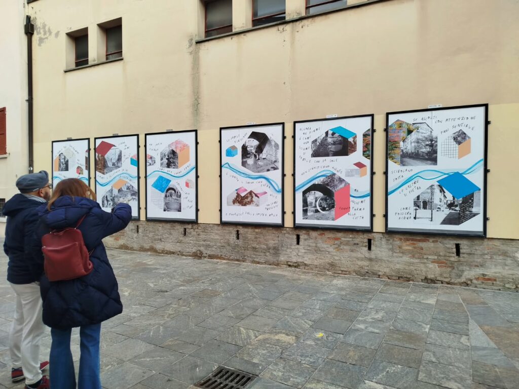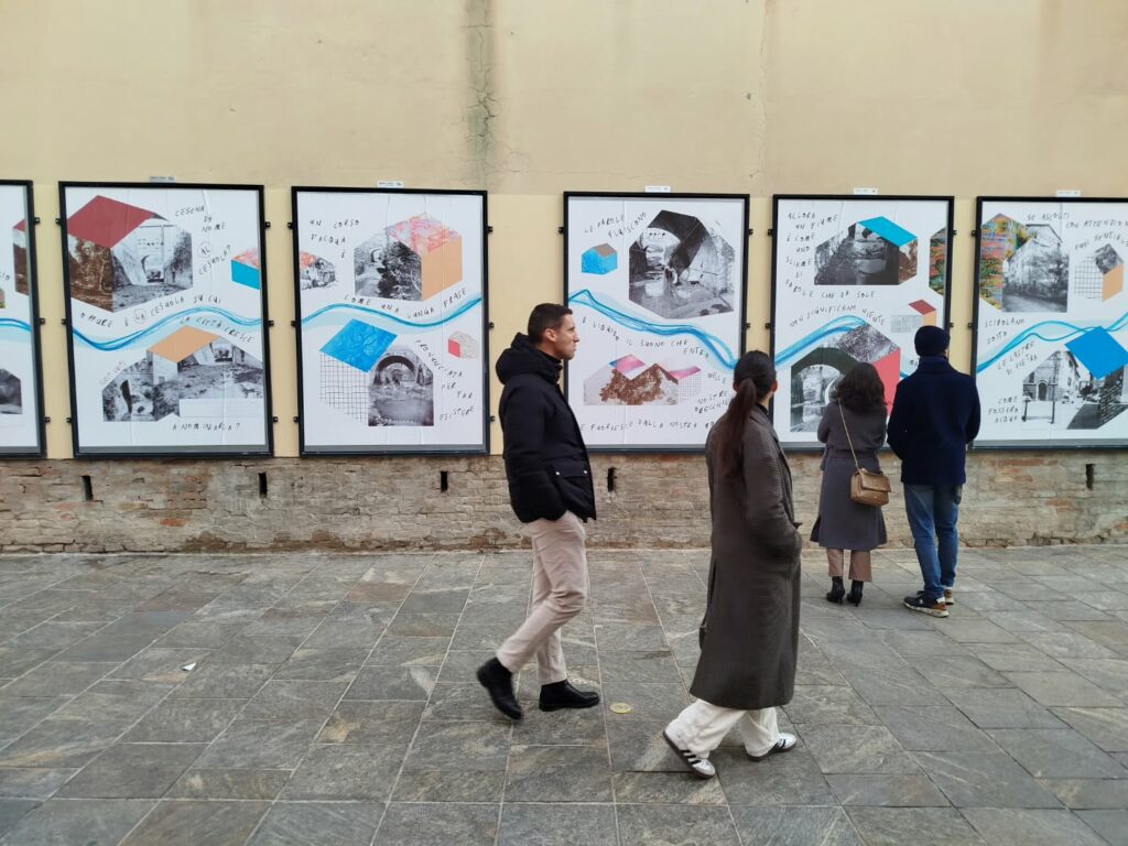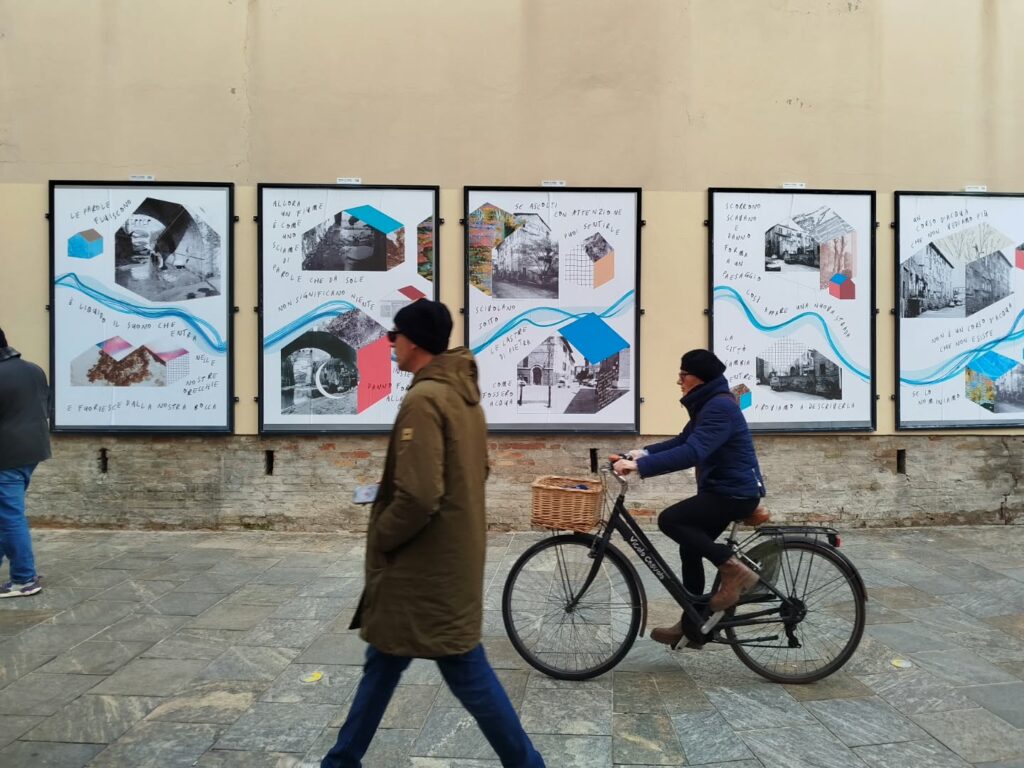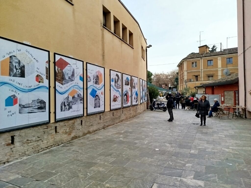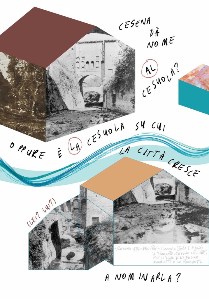 Per la tipologia di co-progettazione che precede la nascita di questo intervento visivo e sulla base delle indicazioni fornite dalla committenza, ho scelto di guardare ai nove manifesti come a un’installazione unica. Un leporello a grande formato che raccontasse, attraverso le immagini fotografiche, la storia di quella porzione di paesaggio urbano. Mi sono quindi affidata alla poesia visiva e alla composizione grafica per innescare una lettura su due livelli che evocasse l’elemento urbano del fiume che prima scorreva al posto della via tombinata negli anni Trenta. Tra immagini storiche e narrazione, chi guarda può scegliere se addentrarsi nel racconto oppure fruire della serie di immagini nella sua totalità.